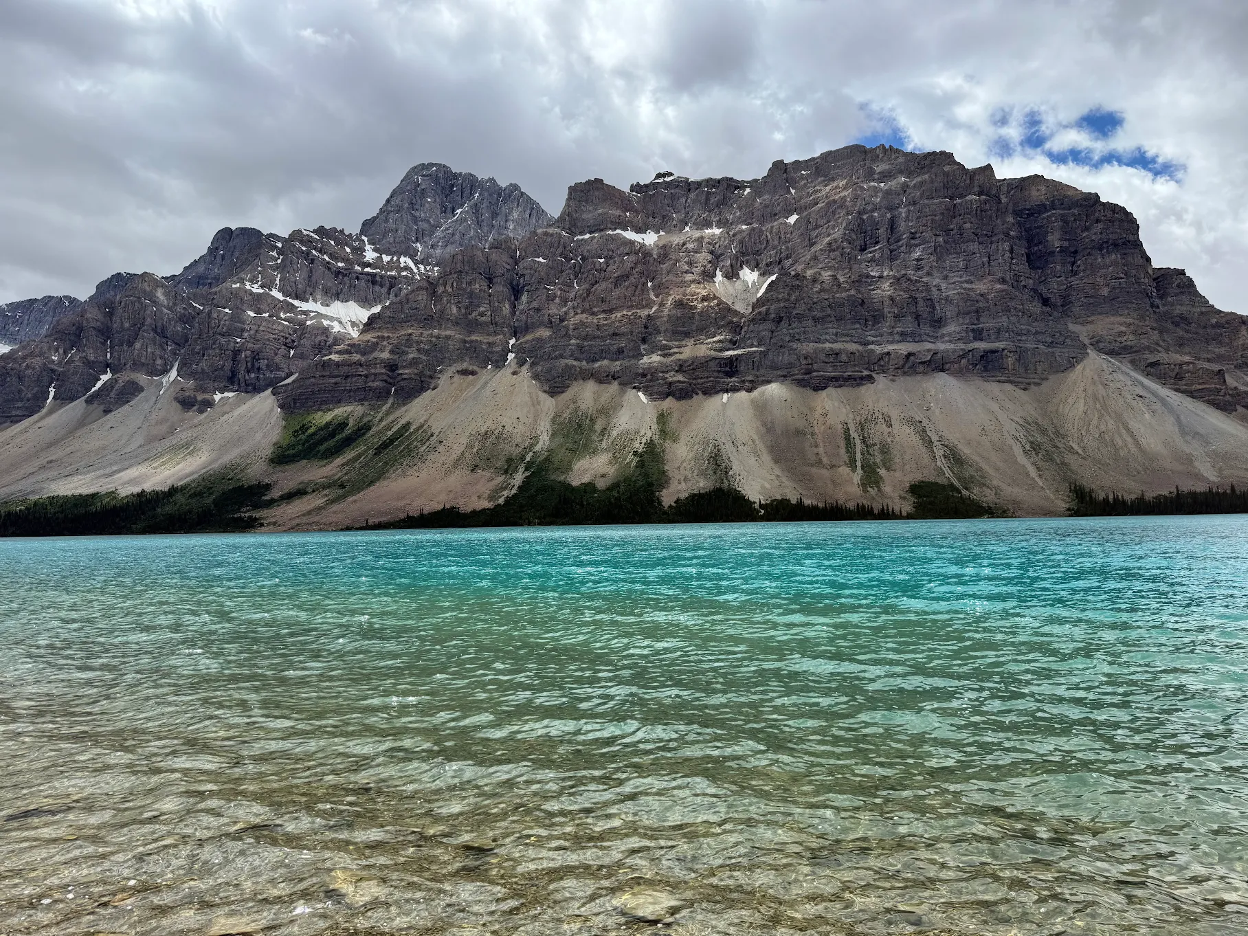 The vivid green color of the water is caused by powdered rock from the glaciers, which reflects the blue-green spectrum of sunlight. The rock type and the amount of it in the water causes the color to vary from lake to lake and month to month, even week to week. Due to its 53 degree latitude and moderately high altitude, the lake is frozen from November until late April or early May.