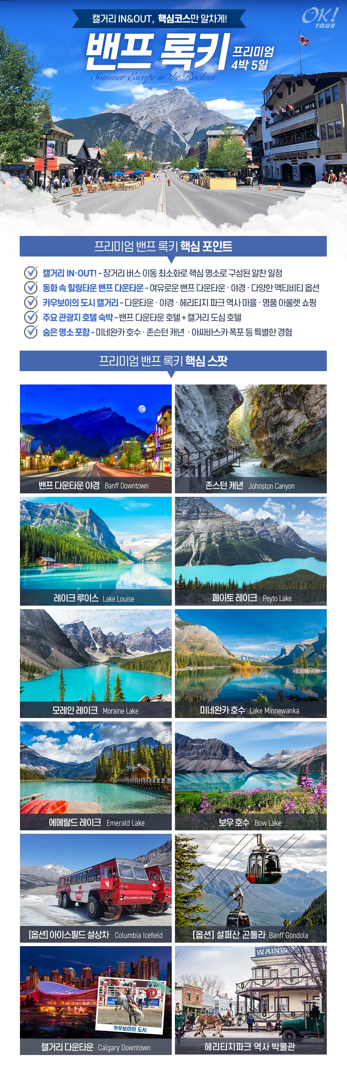 빙하가 녹은 물이 모인 페이토 호수는 록키에서 가장 높은 곳에 위치한 호수이며, 터키색 호숫물과 아름다운 주변 산의 경치로 방문객들을 매혹하는 곳입니다. 여름에는 영롱한 푸른 빛으로 빛나며 꼭대기에 눈이 쌓인 산으로 둘러싸인 모습이 장관을 이루어냅니다. / 7월~9월 출발 시에만 가능하며, 현지 사정에 따라 투어가 불가할 수도 있습니다.